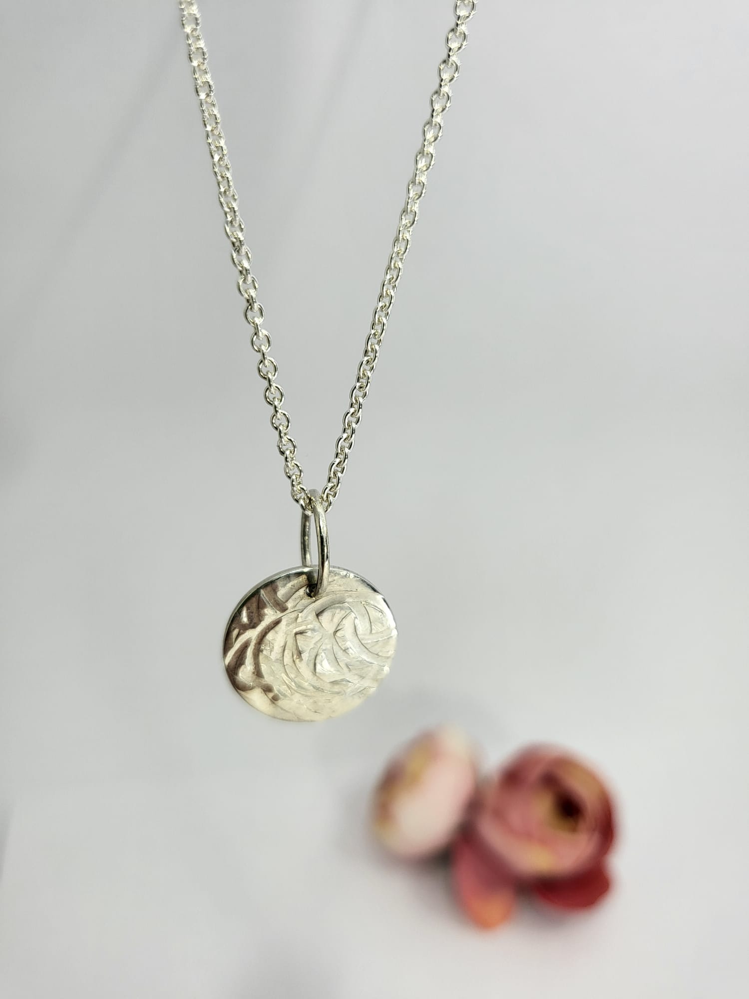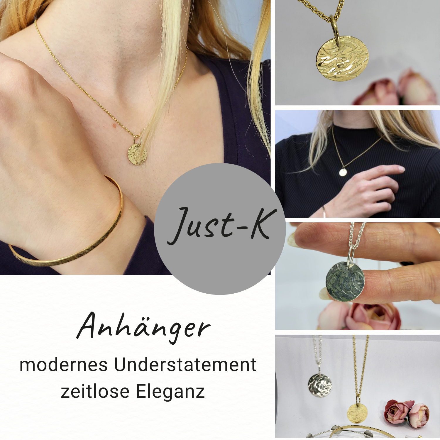 Der runde Anhänger Just-K steht für zeitlose Eleganz und modernes Understatement. Seine runde Form und die fein strukturierte Oberfläche verleihen ihm eine lebendige Tiefe, ohne aufdringlich zu wirken. Schlicht im Design, hochwertig in der Ausführung – ein Schmuckstück, das sich mühelos jedem Stil anpasst.