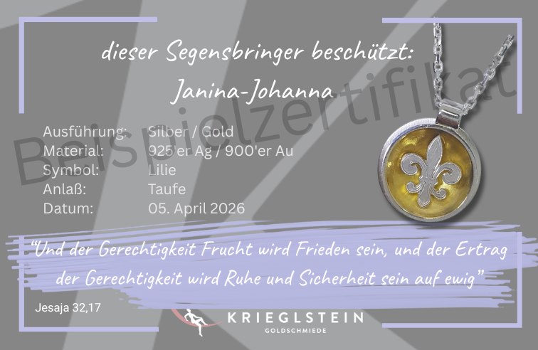 Viele unserer Kunden wählen ihren Segensbringer bewusst nach dem Psalm, der ihnen persönlich am meisten bedeutet. So wird dein Anhänger nicht nur zu einem emotionalen Begleiter, sondern erhält eine persönliche, spirituelle Botschaft. Auf Wunsch kannst du uns auch deinen eigenen Spruch übermitteln, dann passen wir das Zertifikat ganz individuell an – für ein noch persönlicheres und bedeutungsvolleres Schmuckstück.