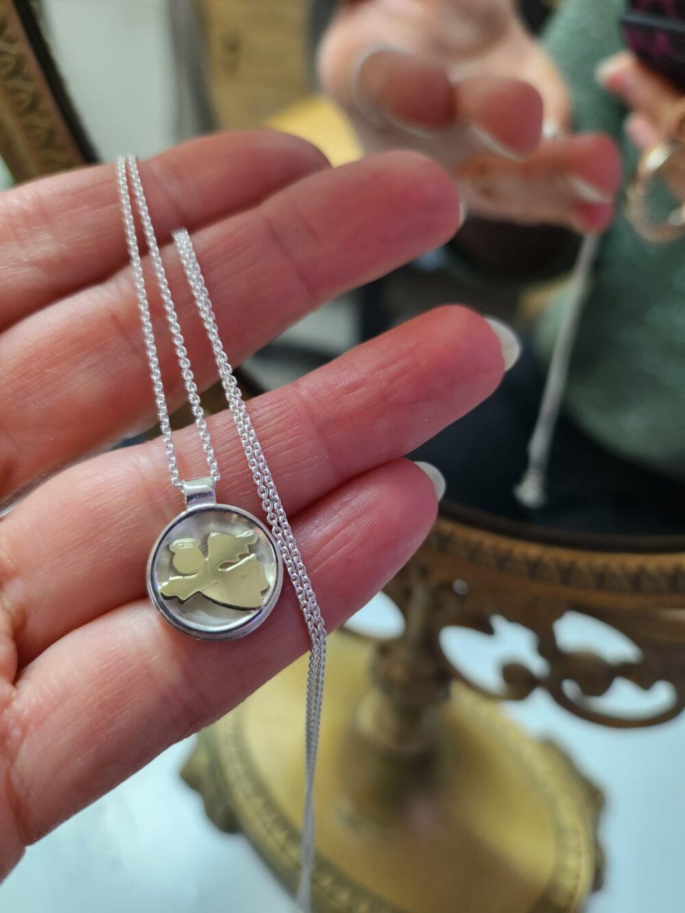 Die Form des Anhängers ist angelehnt an ein Taufbecken, in dem das Kind bei der Taufe symbolisch gesegnet wird. Die sanft matt glänzende Schale und die gerade Rückseite verleihen Stabilität und Ruhe – Sinnbilder für Halt, Geborgenheit und Schutz durch Familie, Freundschaften und Glauben.