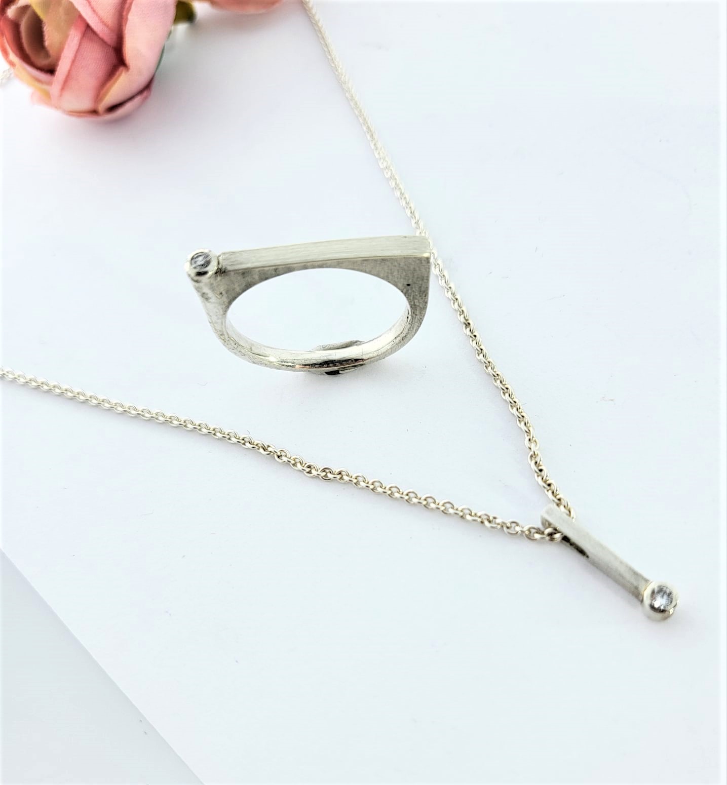 Ein zarter silberner Stab, der quer zum Finger liegt. Seitlich ziert ihn ein Brillant und verleiht ihm damit Leichtigkeit und Eleganz.
